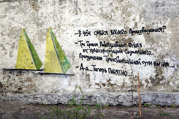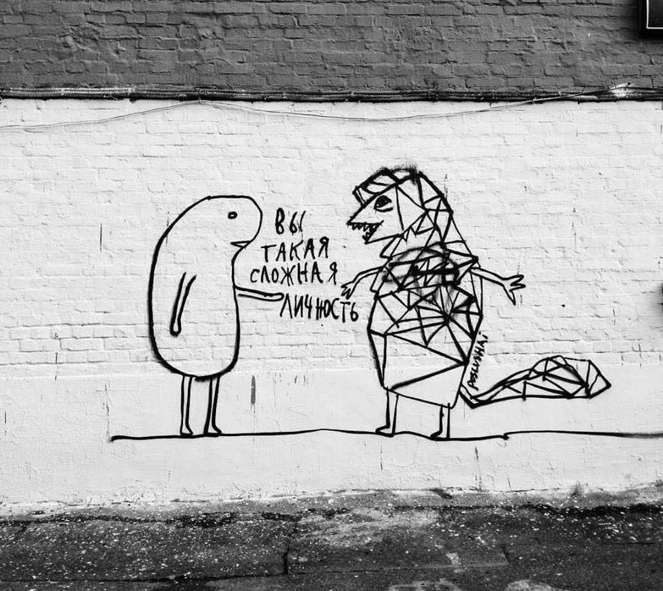 Граффити тоже проходит незамеченным, поскольку число зрителей этого искусства можно считать случайным. В этом году особенно интересными были два автора, работающие преимущественно нелегально, – петербуржец Максим Има с длинными содержательными текстами на стенах и москвичка Ксения (она подписывается Poslushai и ведёт в Фейсбуке «Переменную облачность»), чьи работы, часто заметные в центре Москвы, – ромбовидная пиктограмма с лисьей головой – сопровождали и неизменно радовали меня во время московских путешествий и прогулок по городу.
