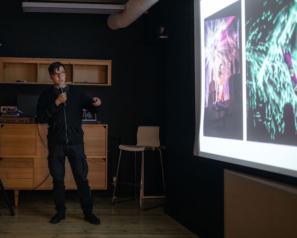 Медиахудожник Наталья Егорова представила междисциплинарный проект «Марсий» – сложную бионическую структуру, повторяющую биомеханику вокального органа птиц. В основе философии проекта лежит древнегреческий миф о Марсии, сатире, который так искусно научился играть на флейте, подражая звукам природы, что смог обыграть в состязании самого Аполлона. Интердисциплинарный художник Сергей Касич в рамках грантовой программы сосредоточился на совершенствовании целого ряда своих идей. Одна из наиболее впечатляющих из них – FingerRing, технологический арт-проект, в котором многоканальным микшером становится сам человек. Одновременное прикосновение к каналам ввода и вывода звука делает человеческое тело проводником и позволяет ему управлять процессом «вручную». Результат – новый взгляд на электронную музыку и интересная возможность вам и вашему телу стать непосредственным участником процесса создания и извлечения звука. Вслед за Сергеем выступил Ипполит Маркелов – представитель такого актуального направления в технологическом искусстве, как биоарт. Эта творческая практика черпает вдохновение в философских, социальных и экологических последствиях генетики, молекулярной биологии и биотехнологий. Проект «MetabolA.I», созданный командой Ипполита 18 Apples (включающей в себя молекулярного биолога и IT-разработчика), – это многочисленные эксперименты с биопринтингом, которые позволяют наблюдать за развитием клеток и их уникальной природной организацией. В процессе размножения окрашенные стволовые клетки выстраиваются в причудливые орнаменты, образуя своего рода произведения искусства, созданные природой и искусственным интеллектом без вмешательства художника.