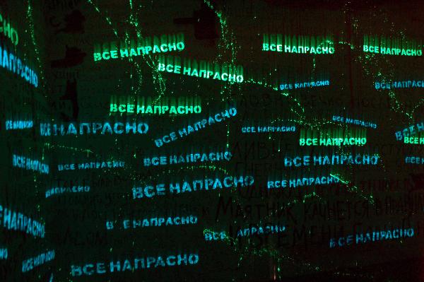 Нижнетагилец Владимир Селезнёв сделал инсталляцию «Пространство борьбы», которая номинирована Уральским филиалом ГЦСИ. В тесной комнате все стены записаны протестными граффити. Внезапно гаснет свет, и читаются лишь неоновые надписи «всё напрасно». Метафора нынешнего протестного движения, конечно, яркая. И смысл её прост как лозунг и плакат. «Всё напрасно»? – Ну, «всё ясно».