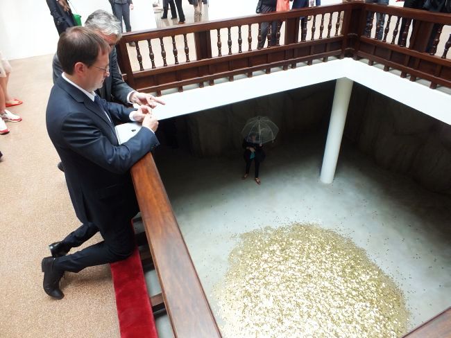 Вот три причины, почему павильон удался и может быть назван лучшим за последние годы. Первая. Предполагается активное соучастие зрителя как соавтора визуального спектакля, вовлечённого в него на уровне тактильном, моторном. Вторая. Вошедшему в павильон не надо сразу шарить глазами по стенам, ища спасительную экспликацию, помогающую хоть что-то понять. Все аллюзии на современное общество консюмеризма, на фетишизм золотого дождя медийности и зомбирование сознания химерами успеха, синонимичного богатству, считываются точно и правдиво. И даже не зная ничего особенного, можно додуматься, что сидящий под потолком офисный мужик, грызущий орехи и швыряющий скорлупу на пол, – это картинка вывернутого наизнанку, пародийного мира по отношению тому, что представлен в центральном зале. Третья. Фундаментом подобной общительности и доверия выбран мир искусства. Именно его универсальный язык помогает поверить увиденному и сочувствовать ему. Инсталлирован проект чудо как красиво. Он насыщен многими визуальными аллюзиями, от картин Тициана и Рембрандта до Родена, Магритта, Ханса Хааке. Кстати, в магистральный для нынешней биеннале сюжет о «теневой антропософии» российский павильон тоже органично вписывается.