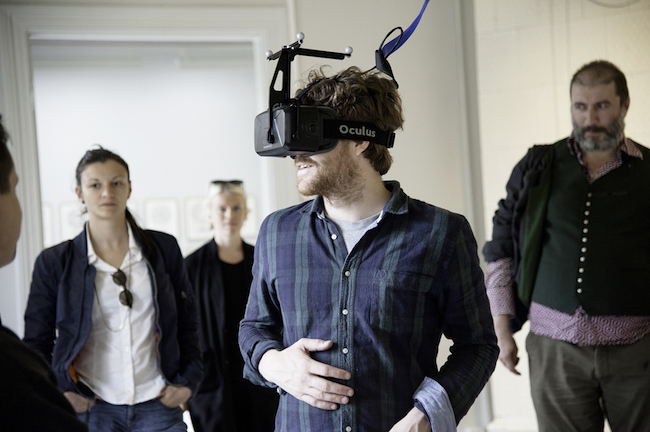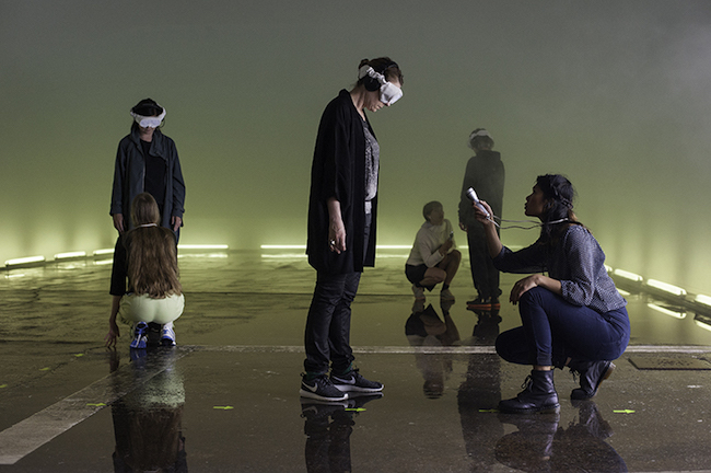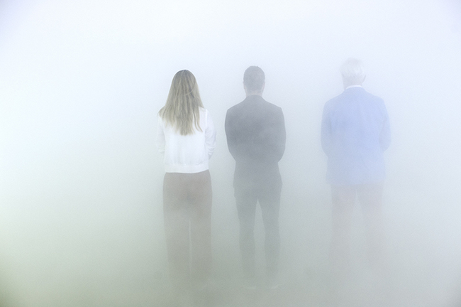 Прежде чем попасть в один из двух выставочных залов (биеннале проходит в двух пространствах –Momentum Kunsthall в историческом центре Мосса и в Galleri F 15 посреди леса в десяти минутах езды от центра), зритель должен пройти сквозь плотный туман. Это работа японской художницы Фуджико Накайя, которая создаёт из тумана скульптуры и заполняет им самые разные помещения вот уже 40 с лишним лет. Побродив внутри влажной субстанции и не видя ничего дальше своего носа, зритель как будто проходит подготовительный этап, очищающий взгляд от всего лишнего и одновременно отсоединяющий его физически от реального мира, из которого он только что сюда шагнул. Время от времени из тумана возникают люди в белых масках и наушниках, плотно закрывающих глаза и уши, – они перемещаются, держа за руку смотрителей выставки или самостоятельно, делая нерешительные шаги под диктовку нежного голоса, звучащего в наушниках. В отличие от только что вошедших, они уже испытывают на себе эффект сенсорной депривации и находятся в воображаемом мире, придуманном для них дуэтом Lundahl&Seitl.
