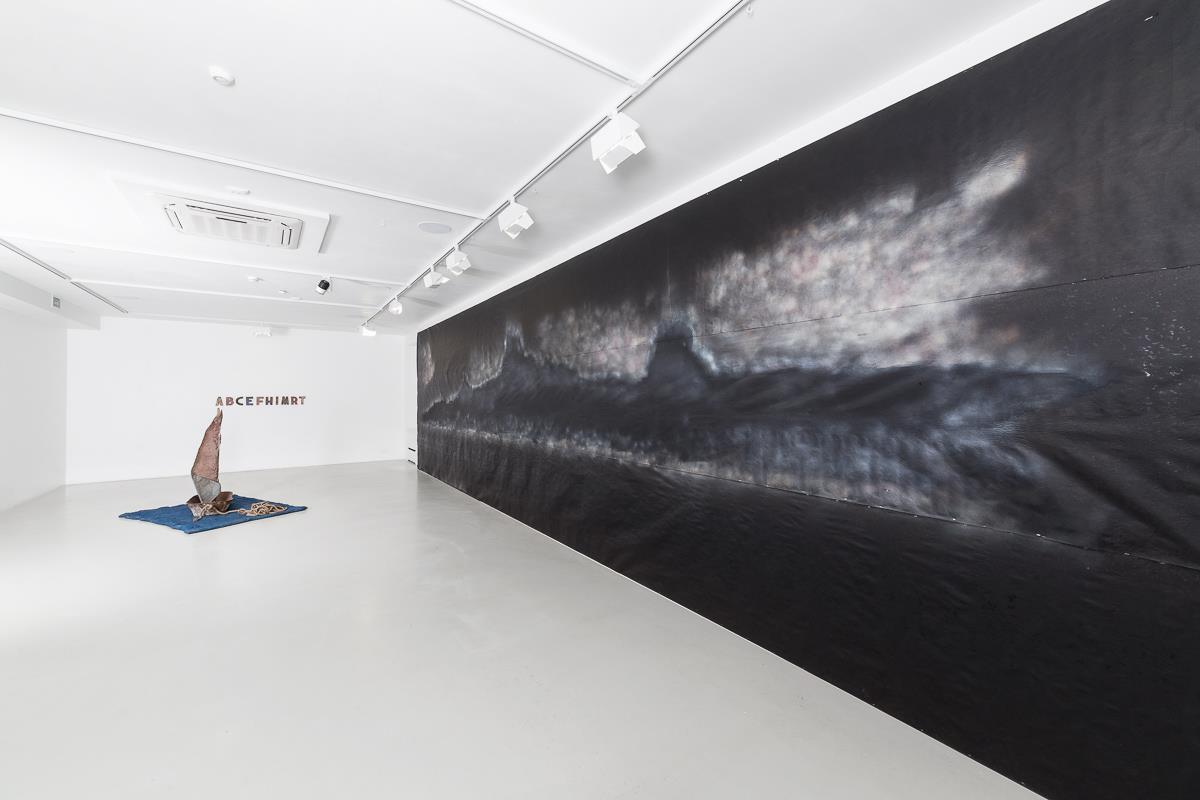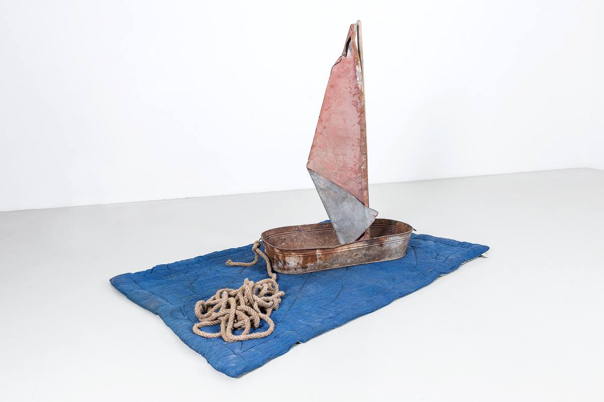 Инсталляция Хаима Сокола «Значит, нашего появления на земле ожидали» в галерее Anna Nova необычайно эффектна (куратором проекта выступила Елена Стрыгина). Это уже третий по счёту проект художника, сделанный в этой петербургской галерее. По своей тематике он совпал с ещё двумя известными выставками, поднимающими тему беженцев, – чёрной лодкой Ай Вэйвэя, рассекающей сейчас зал Выставочного дворца в Праге, и экспозицией «Плот» под кураторством Яна Фабра в музее в Остенде. Благодаря устройству галерейного пространства разделённая на два этажа единая инсталляция раскрывается постепенно. В первых залах расставлены оцинкованные и полные грязной воды вёдра, сомкнутые, будто в молчаливом ожидании, а над ними карта двух полушарий, сшитая из половых тряпок. Проходящего между волнообразными рядами этих орудий чёрного труда зрителя выталкивает дальше, на второй этаж, где написана широкоформатная марина тот же чёрно-синий оттенок грозового моря был расплёскан по ведрам. Центр зала занимает характерный для Сокола объект из «бедных» материалов из проржавевшей шайки, старой швабры без ворса, листа кровельного железа, куска каната и лазоревого одеяла художник сооружает плывущую по морю лодку под парусом. Корабль держит путь к надписи на стене. Десятибуквенное слово от А до Т разом не читается, но литеры всё равно складываются в пугающее Arbeit Macht Frei. По рассказу художника, купленные в дизайнерской лавке в Амстердаме деревянные буквы были сделаны из индонезийских лодок, таким путём вернувшихся в бывшую метрополию из когда-то голландской колонии.