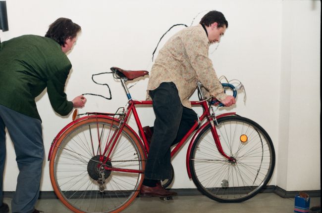 Уже через месяц новоявленная группа сделала в том же «Борее» первый перформанс: Сергей Спирихин, Игорь Панин и Владимир Козин стояли у стен с завязанными глазами и ложками во рту, из ложек полыхал огонь, а Вадим Флягин – самый нищий, самый тщедушный и самый экстремальный из товарищества – крутил педали горящего велосипеда. Перформанс был посвящён Мартину Хайдеггеру: культовому философу, чьи труды тогда только-только появились в русском переводе. Хотя из всех Тупых читать Хайдеггера пытался разве что Спирихин, само имя немецкого философа было олицетворением интеллектуального подвига, некоего мира ума и чувства, категорически не совпадающего ни с российской жизнью, ни с российским искусством, но поди ж ты – вдруг оказавшегося востребованным у кучки маргиналов. Далее такие пространства выпадения, личной аскезы и ухода в умственные дали будут возникать в творчестве Тупых постоянно. Более того, они будут не темой их размышлений, а деятельной жизненной практикой: «Это только на первый взгляд всё это галиматья и бормотание. Это, как говорится, на самом деле манифест. Истинную (собственно) галиматью и бормотание мы часто практиковали, так сказать, для самоусовершенствования. Закрыв глаза и ничего не осознавая, мы отдавались неконтролируемому потоку речи по 6, по 8, по 12 часов, не вставая из-за столика Борея»*.