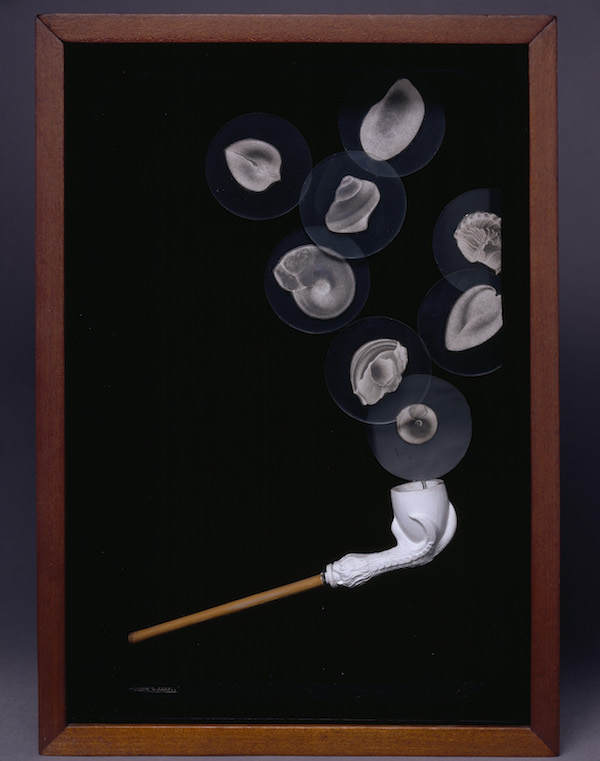 Да, тут вспоминается Магритт – и Джозеф Корнелл этого не скрывает. Но у Магритта трубка явлена в своей вещественности, в своей основательной форме, чтобы придать дополнительной нелепости нелепому миру очевидностей; «Это не трубка» невозмутимо ставит в тупик обывателя. Корнелл сделал трубку мистическую, вылетающие из неё окаменелости – будто души давно умерших людей, а то и корпускулы Святого Духа вовсе. Я уже не говорю, что его трубка имеет совсем иную форму, нежели магриттовская. Нетрубку бельгийца мог курить любой горожанин 1920–1950-х, например, у комиссара Мегрэ наверняка была такая же. Она изогнута, немного пузата и уютно ложится в ладонь. Трубка Корнелла, напротив, вытянута, пряма, тонка и действительно похожа на лапу хищной птицы. При этом её форма, материал и прочее – всё отсылает к XIX веку. Прежде всего, сама морская пенка, этот белый пористый минерал; европейцы стали массово использовать его для производства курительных трубок только в 1800-е годы. Но это не главное. Главное другое – окаменелости. Напомню: самый серьёзный, драматичный, острый спор середины позапрошлого века, спор, в котором теология переплелась с естественными науками, спор, который был призван разрешить Дарвин, заключался в том, как рационально совместить данные бурно развивающейся геологии (и палеонтологии прежде всего) с библейской хронологией Сотворения Мира. Согласно Библии Бог создал мир значительно позже того, как, согласно палеонтологии, погибли ракушки и моллюски, оставившие отпечаток в каких-нибудь меловых скалах Дувра. Сейчас уже не понять всей серьёзности той дилеммы – а жаль. Она поважнее будет судеб рыночной экономики или этических проблем, связанных с сексуальным образованием школьников.