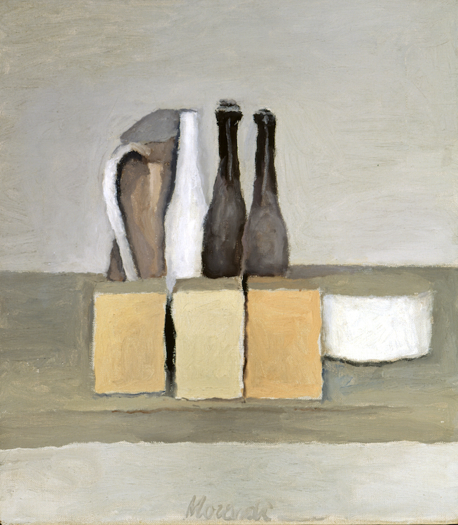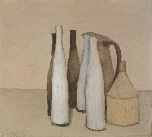 Эффект натюрмортов Моранди совсем не в молчании, как принято думать. Сказать «молчаливый» значит всего лишь указать на отсутствие голоса и – попутно – на синестетический эффект его живописи, которая «говорит», хотя рождена не для этого. Работам Моранди свойственна атетичность. В его словаре всякий предмет существует поодиночке. Кувшин – среди серии почти идентичных кувшинов, ваза – среди почти одинаковых ваз. Каждый – за пределами любых оппозиций, он не знает о них, так же как тени, отбрасываемые его бутылкой, не знают о присутствии света.
