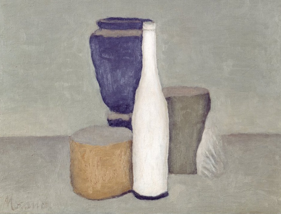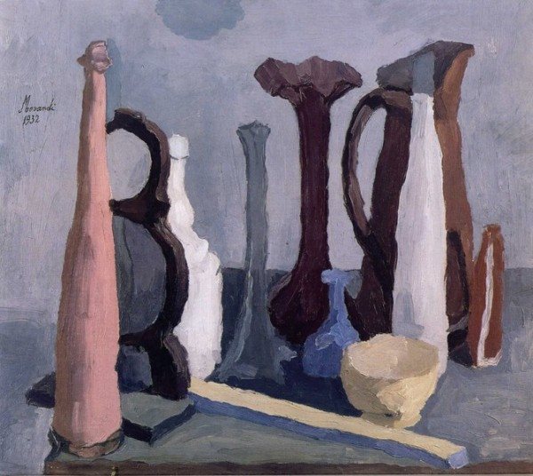 Любопытно, что дистанцируясь от метафизической живописи (от Де Кирико или Карра), Моранди не разделяет, но, наоборот, примиряет различные жанры письма. Вещам уже не приходится выбирать между тем, чтобы отдаляться от их вещественности (реалистичности) или от их идеи (некоего внутреннего, впечатанного штрихкода).