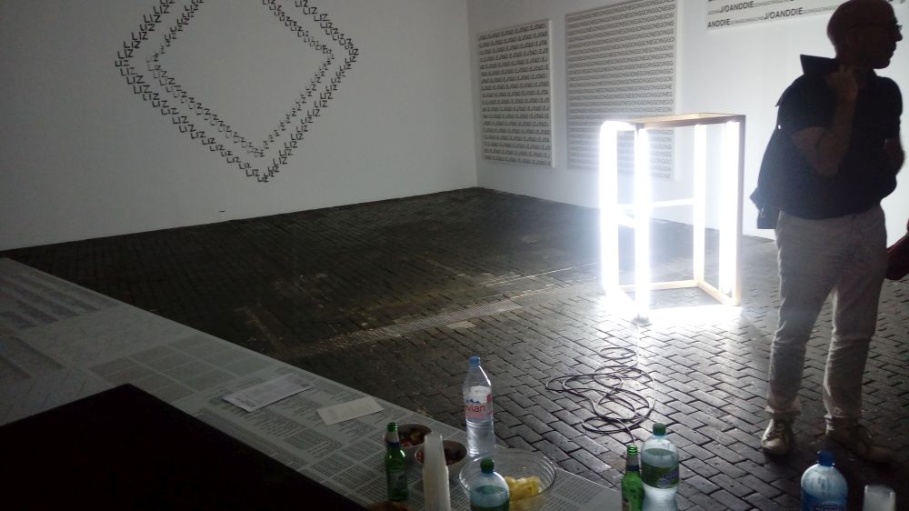 Так, немецкий художник Karl Holmqvist (1964), существующий на пограничье текстуального и визуального полей, был приглашён создать пространство, в котором слова могли бы быть «поставлены» (mis en scène). Надписи и вправду покрывают собой ту слегка возвышающуюся платформу, на которой проходят выступления сонорных и конкретистских поэтов. Наряду с этим письмо оккупирует стены, буквенная вязь трансформируются в узор обоев, а то немногое пространство, что остаётся свободным от текста, заполняют ещё скульптуры из слов. Точнее, можно, перефразируя одного классика «объективной поэзии», сказать, что скульптура состоит не из слов, а из флуоресцентных трубок (которые при соответствующих осведомлённости и обхождении оборачиваются четырёхбуквенными словами).