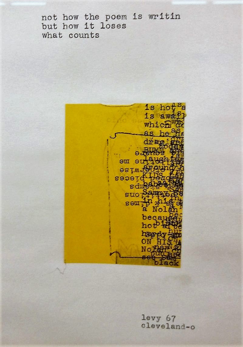Этажом выше также представлена первая европейская экспозиция D.A. Levy (1942–1968) – одной из наиболее загадочных и нонконформистских фигур американской культурной сцены. Это художник (book artist) или даже поэт книги (poète du livre), всегда создававший тексты, держа в уме форму «книжного объекта» и потому считающийся предшественником культуры зинов – оригинальных самодельных изданий, размноженных небольшим тиражом посредством фотокопирования. Будучи и сам альтернативным издателем, Леви вручную раскрашивал копии своих изданий, проводя параллель между своими действиями над словами – обрезка, фрагментация, стирание – и социальным радикализмом. Выступая за легализацию лёгких наркотиков и против войны во Вьетнаме, он был постоянно под наблюдением полиции, а в 1966-м ещё и обвинён – по почтенной исторической аналогии – в развращении юношества и распространении обсценных произведений (в его защиту тогда устраивали чтения другие развратники – Гинзберг и другие битники, а Sonic Youth поместили его рисунок в оформление своего альбома «NYC Ghosts and Flowers»). Выйдя из тюрьмы, он уничтожил большую часть своих работ, уникальные экземпляры которых всё же уцелели, как водится, специально для этой выставки.